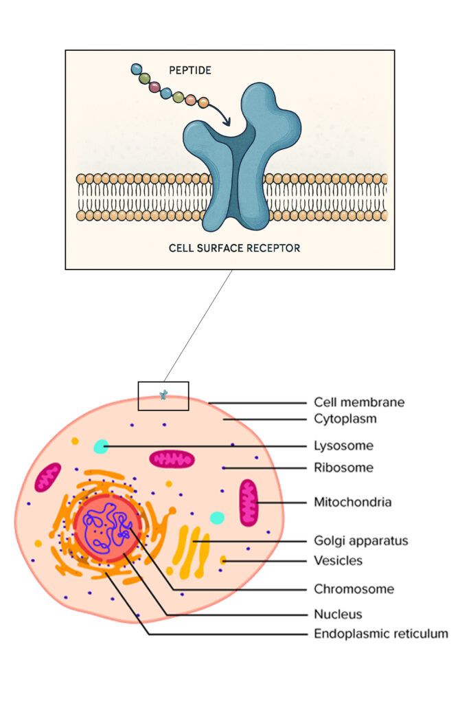 In order for a peptide to trigger a reaction it must first bind to a specific receptor that can be found inside or as well outside of a cell. A cell can be seen as a big factory facility that has many different sections and functions, surrounded by a membrane that holds everything together.